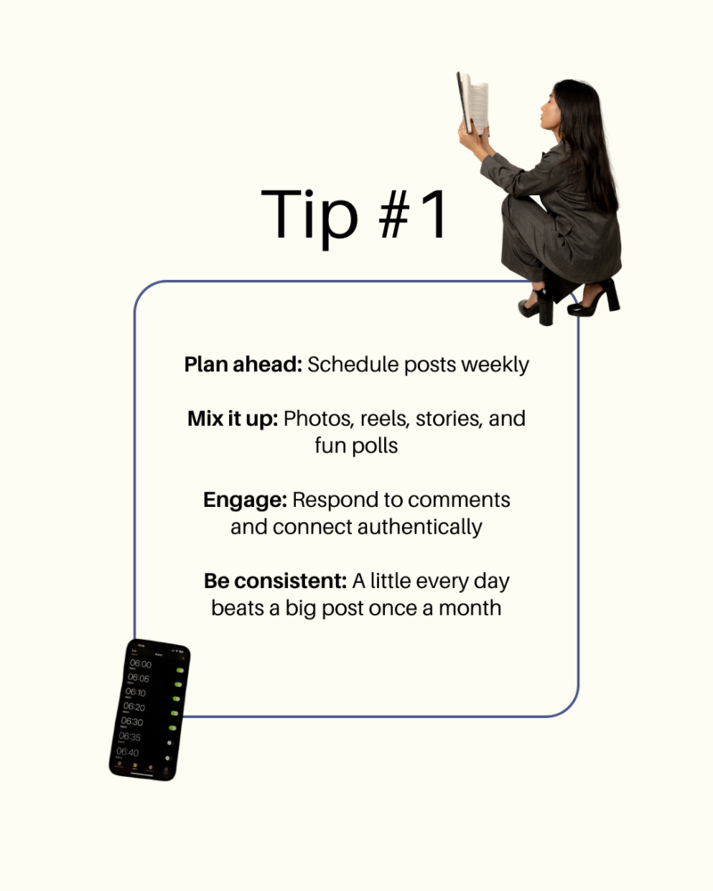 Content Types: Reels with tutorials/tips, feed posts (branded/lifestyle), interactive stories